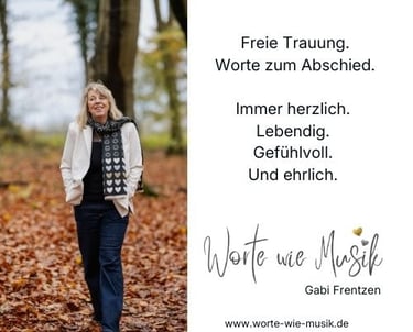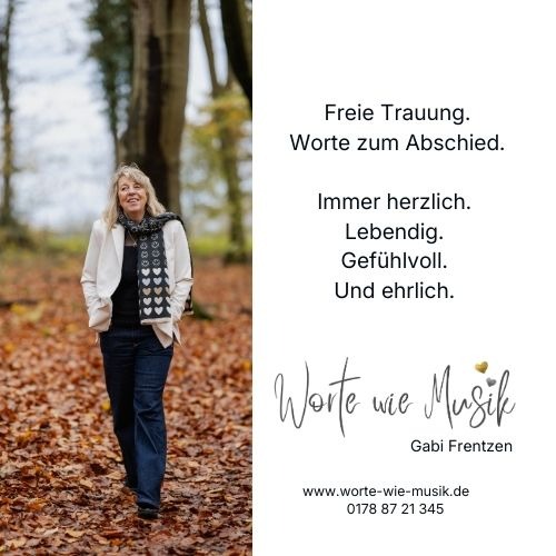 Gerne will ich mich vorstellen, hallo, ich bin Gabi Frentzen – Journalistin, Trau- und Trauer-Rednerin, Eventplanerin, Musikerin und leidenschaftliche Erzählerin. Seit über vier Jahrzehnten stehe für gelebte Menschlichkeit im Journalismus. Aus der Lokalpresse kommend habe sie Tausende Geschichten gehört, gesehen und festgehalten – Geschichten, die das Leben schreibt. Seit fünf Jahren verbinde ich diese Erfahrung mit meiner Tätigkeit als Rednerin. Vor allem meine Leidenschaft Trauerreden hat mich zur Zeitensammlerin gemacht.